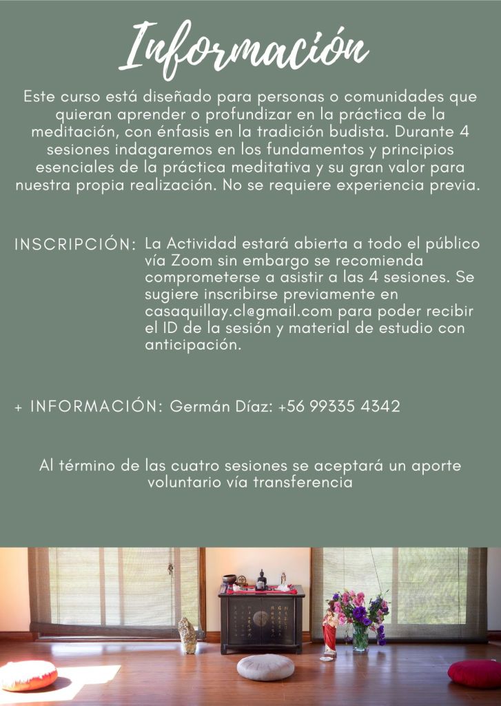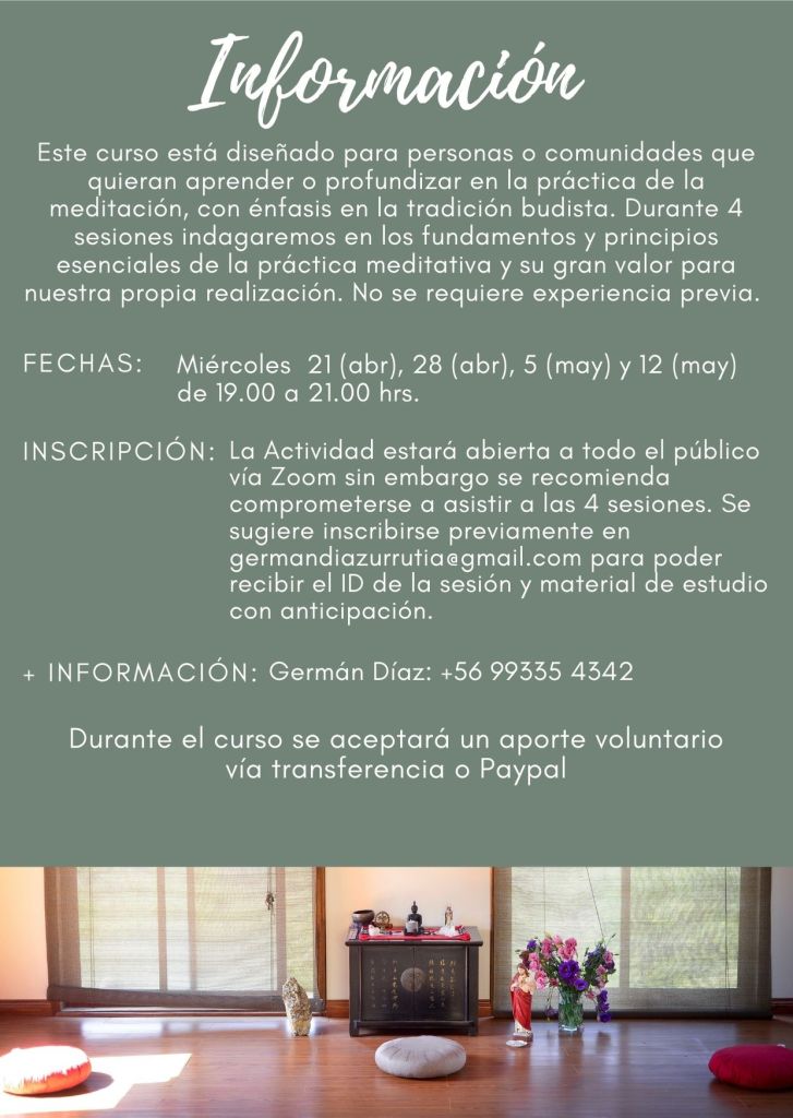 TALLER FUNDAMENTOS Y PRÁCTICAS DE LA MEDITACIÓN Miércoles: 21 (abr), 28 (abr), 5 (may) y 12 (may) de 19.00 a 21 Hrs